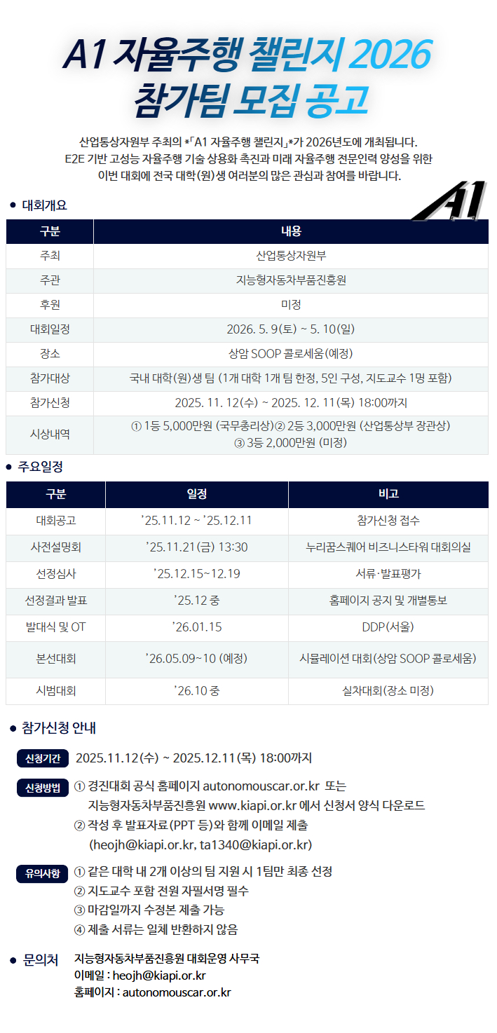 A1 자율주행 챌린지 2026의 모집공고입니다.